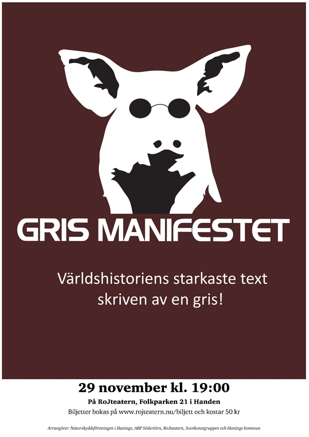 Scenkonstgruppen fortsätter turnén med teaterföreställningen Grismanifestet och kommer nu till RoJteatern. Grismanifestet handlar om en kvinna som försöker hantera sin allt tilltagande ångest för hur vi behandlar natur, miljö och klimat. I föreställningen kommer hon på hur hon ska vända sitt missmod till en konstruktiv kraft. Genom en blandning av fantastik och realism skapar pjäsen sin egen värld. Med hisnande bilder skildrar pjäsen krocken mellan å ena sidan naturen och livsbehoven och, å den andra sidan, vårt rationella samhälle.