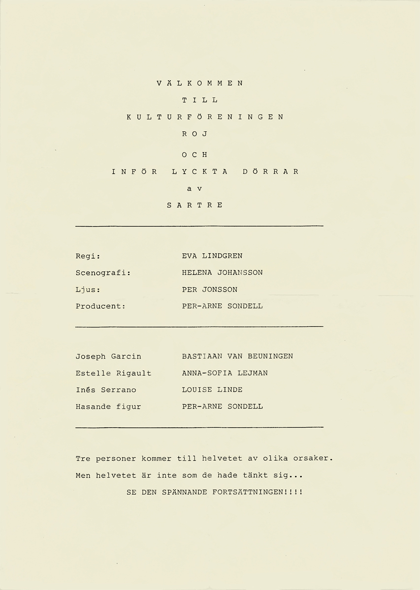 Jean-Paul Sartres Inför Lyckta Dörrar är en föreställning om hur man får stå till svars för sina handlingar och som behandlar frågor om ondska, svek och ånger. Som ofta är fallet med Sartre bjuds det på lika delar drama och svart humor!